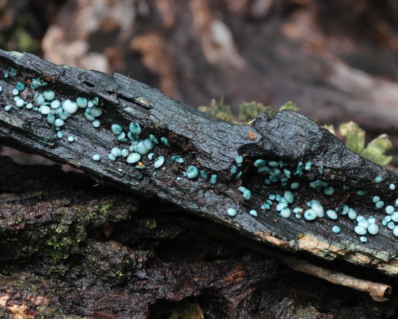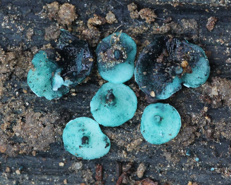 | ・径2〜4mmのこま状で、硬い腐朽材に発生し材を青緑色に染める。 |