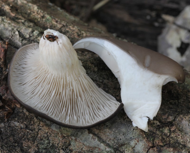 | ・傘/饅頭形→貝殻形→半円形。表面は平滑で湿り気を帯びる。色は初め黒色〜灰青色、のちねずみ色〜灰褐色、灰白色になる。 |