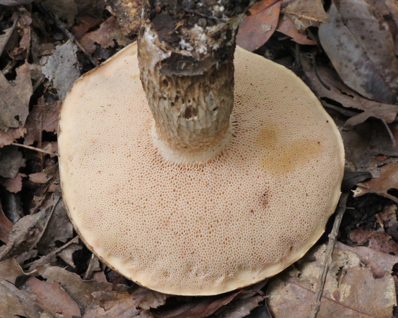 | ・管孔/上生〜離生。初め白色、のちピンク色を帯び、ついには灰橙色となる。孔口は径1mm内外、菅孔と同色、傷付けば褐色に変わる。 |