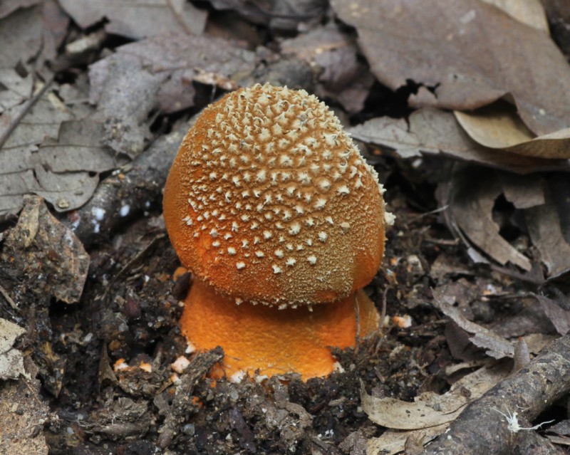 | ・柄/径4〜9mm、上部は細まり、基部は球根状。表面は傘同様の粉物質に覆われ、上部に白色膜質のつばがあるが脱落しやすい。つぼは粉質いぼ状でやや輪状に残る。 |