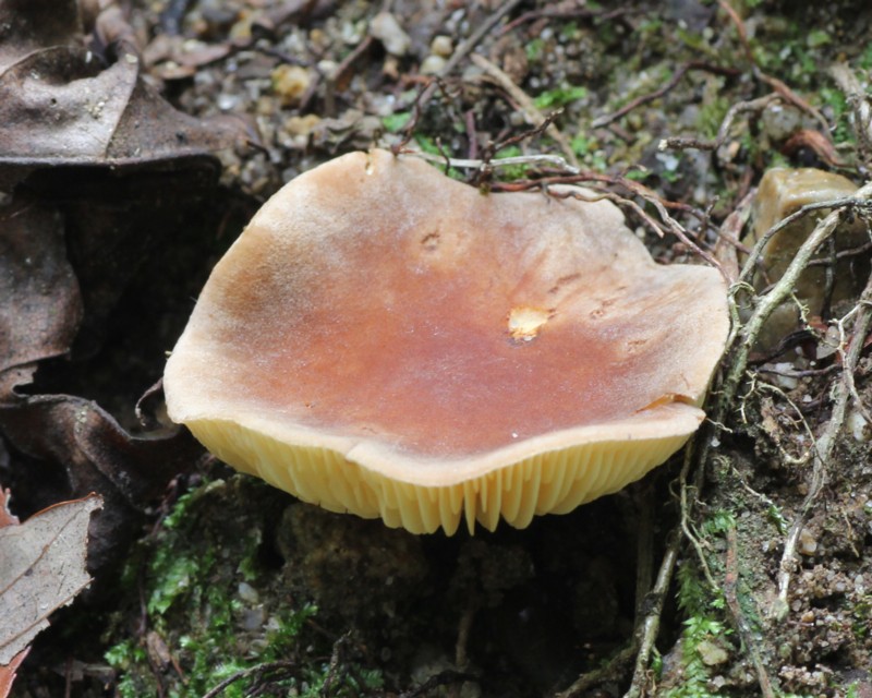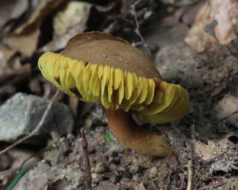 | ・ひだ/長く垂生し、脈で連絡する。鮮黄色、のち黄褐色~帯オリーブ褐色となる。 |