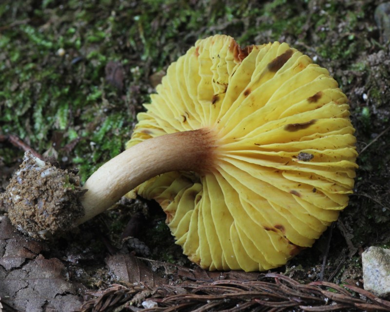 | ・柄/太さ5~10mm、上下同径か下方が細まる。表面は黄色~帯黄褐色で微粉状~細鱗片状。上部にひだに接続する縦条がある。 |