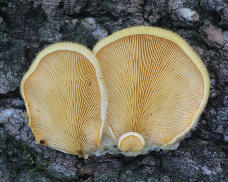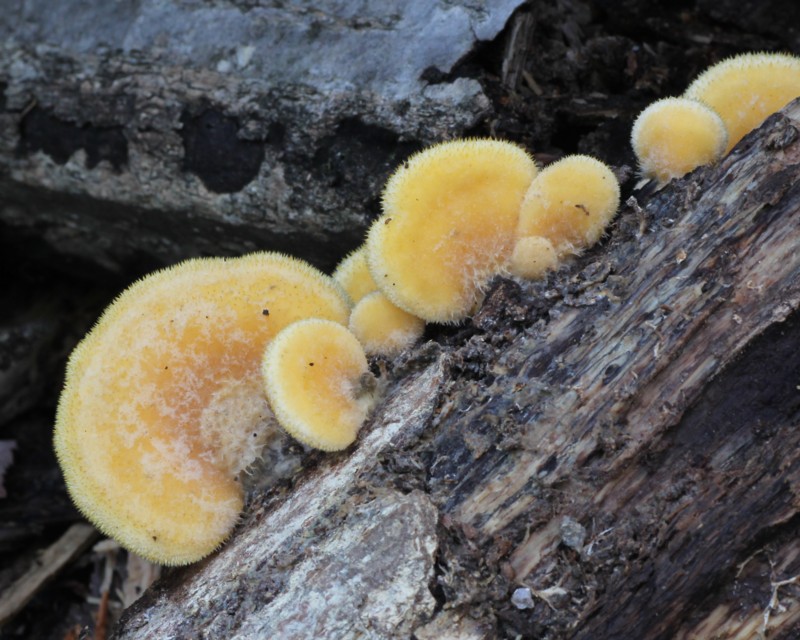 | ・傘/半円形→じん臓形、または円形。傘の横、または背面の一部で基物につき、縁部は内側に強く巻く。表面は鮮黄色〜淡黄色で粗い毛が密生する。 |