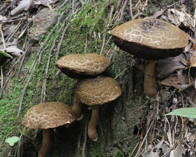 | ・傘/半球形→饅頭形→扁平。表面は乾燥し、褐色〜濃ワイン赤色の大きな鱗片に覆われ、成熟するにつれ亀裂が生じ菊花のような模様を呈する。 |