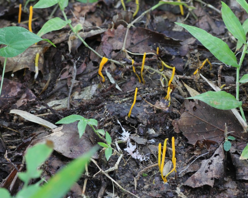 | ・子実体/円筒状〜棍棒状で黄色〜橙黄色。先端は普通尖らず鈍頭。根もとは細く、色うすく円柱状。 |