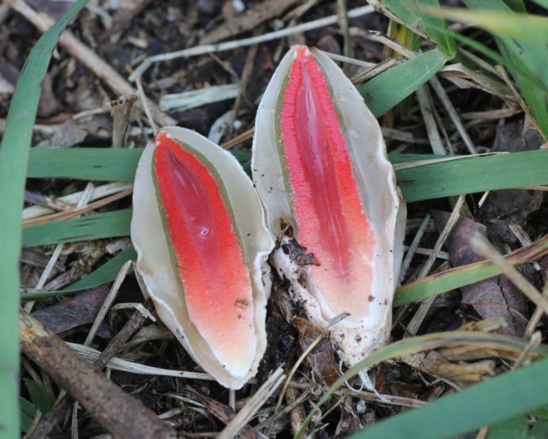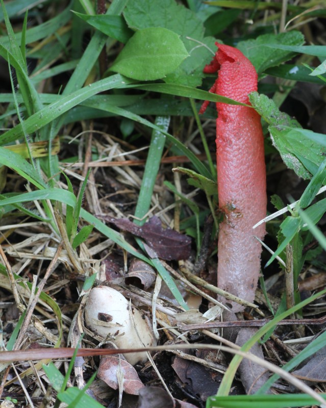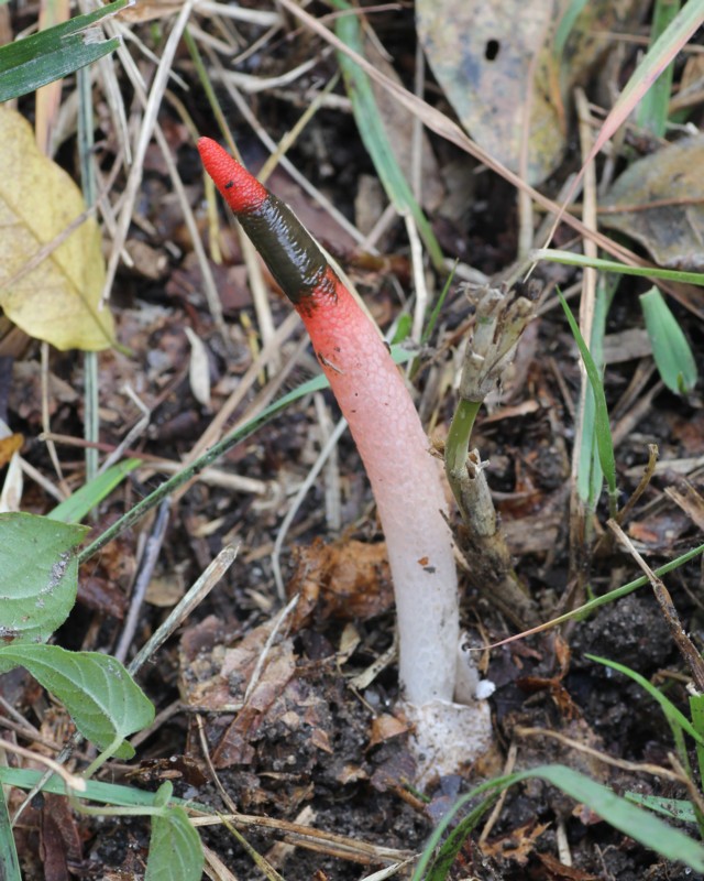 キツネノロウソク属(Mutinus)は、スッポンタケ属(Phallus)と違って鐘状の傘はない。 |