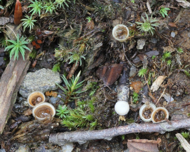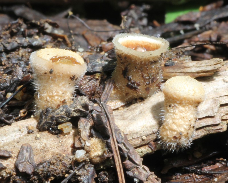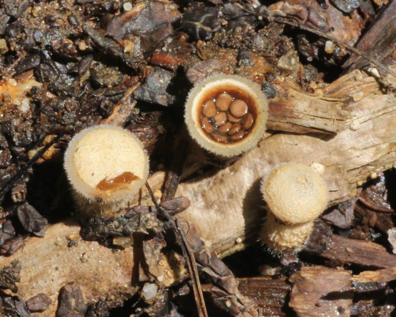 | ・子実体/幼菌は類球形で白毛を密生する。成熟すると上部の殻皮が破れ、るつぼ形となり小塊粒が見える。殻皮は1層で表隔膜なし。 |