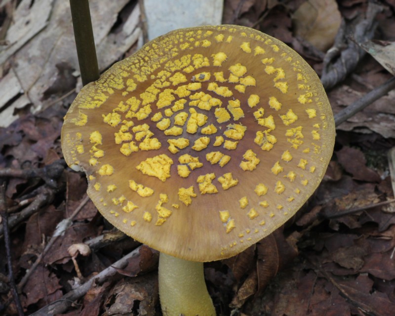 | ・傘/卵形→饅頭形→扁平。表面は帯褐黄色〜黄褐色で、全面に鮮黄色粉質のいぼを散布する。 |