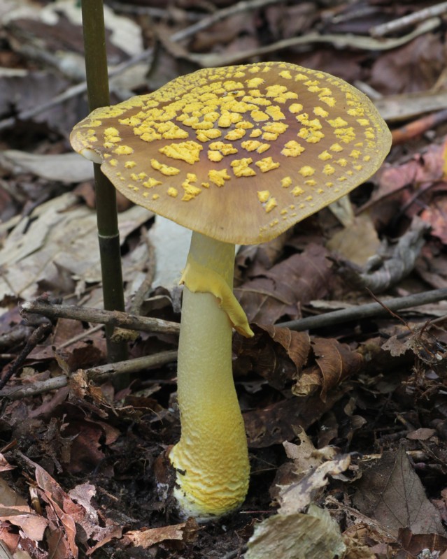 図鑑『新版/北陸のきのこ』では、石川、北海道 ? には「ココガネテングタケ(A . pulchella)・小黄金天狗茸」と言う種があるようです。本種と良く似ているようですが、違いは良く解りません。 |