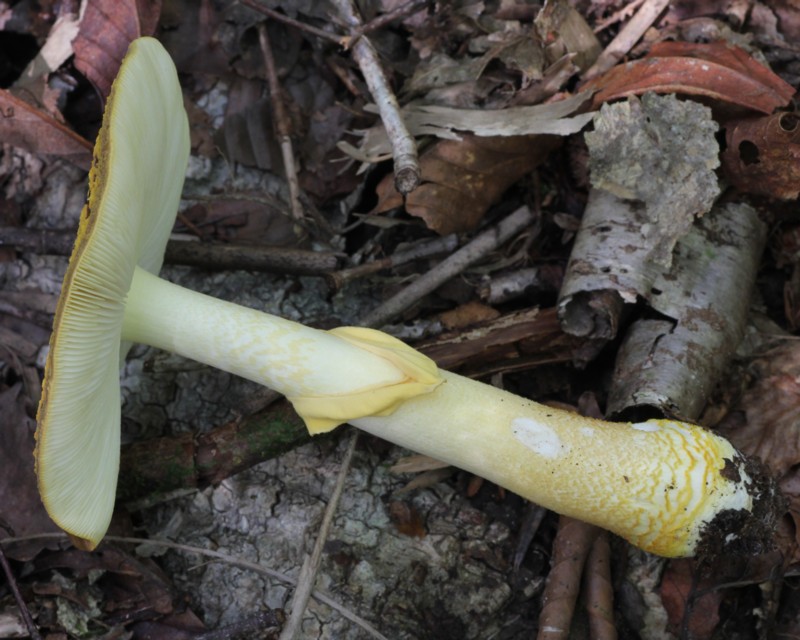 | ・柄/径7〜10mm、表面は淡黄色、上方に淡黄色の膜質つばがあり、基部の肥大部には黄色い粉質のつぼの破片が付く。 |