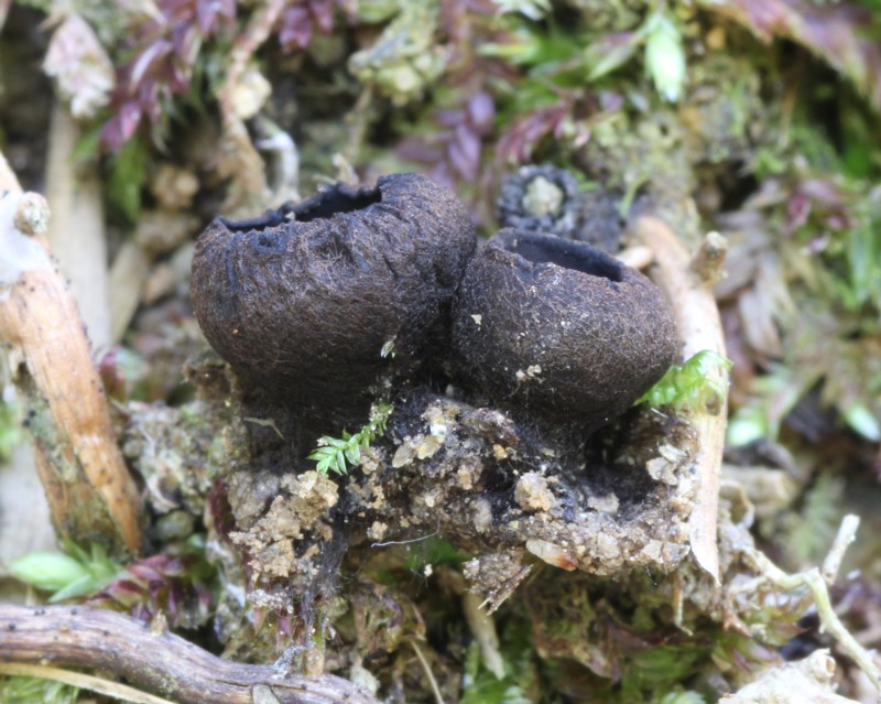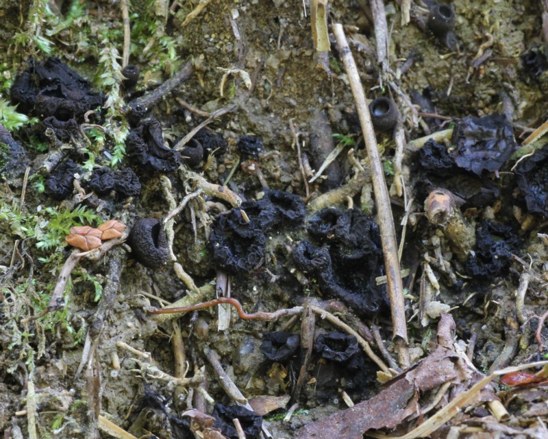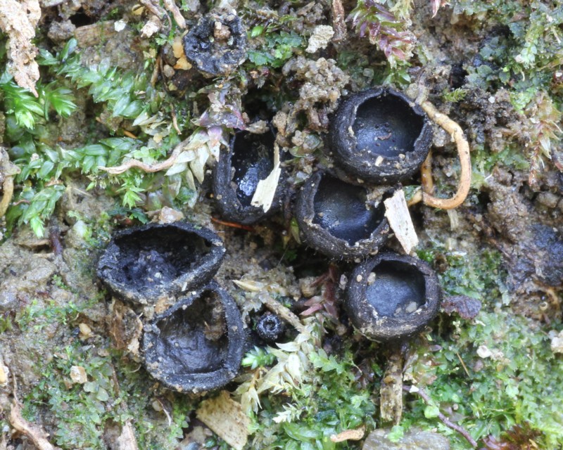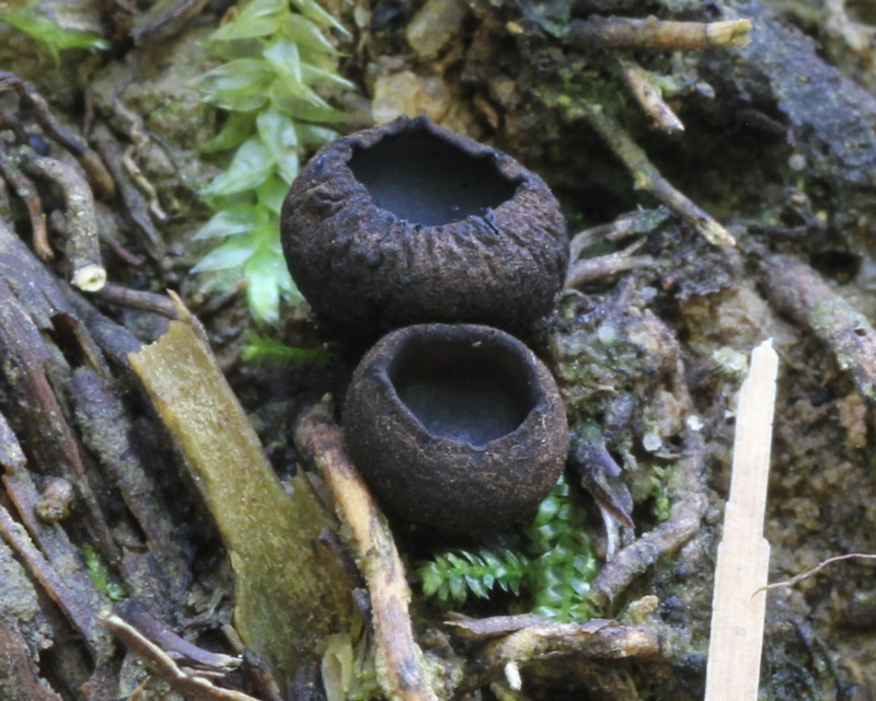 類似種の「ニセクロチャワンタケ」は本種より大きく、通常、柄があることで見分けられるそうです。また、図鑑には殆ど載っていませんが、「クロヒメチャワンタケ」と言うのもあるようで、それとは胞子の形を見る事が必要で、肉眼だけでの判断は難しいとの事。当サイトは顕微鏡での観察は行っておりません・・・4つ星にします。 |