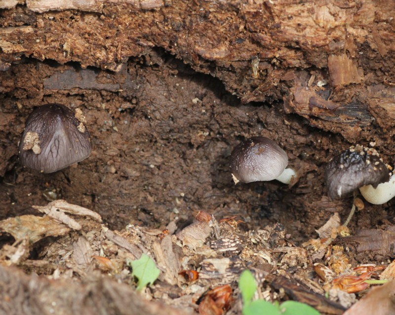 | ・傘/饅頭形→中丘扁平。表面は粘性強く、中心部は紫黒色、周辺部は灰紫色で放射状に広がる網目状の皺がある。 |