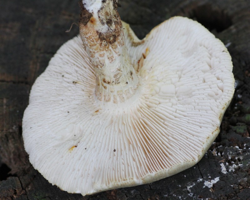 | ・ひだ/白色で密。垂生し柄に線状に伸び、縁は鋸歯状。 |