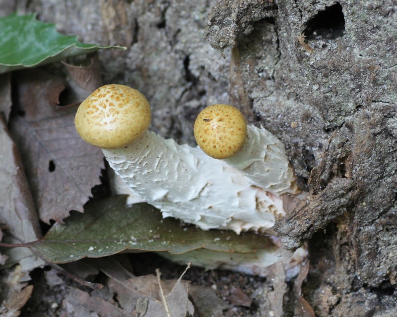 | ・傘/半球形→饅頭形→浅皿状。表面は白〜淡黄色の地に褐色鱗片を放射状につけ、時にひび割れができて白い肉をあらわす。 |