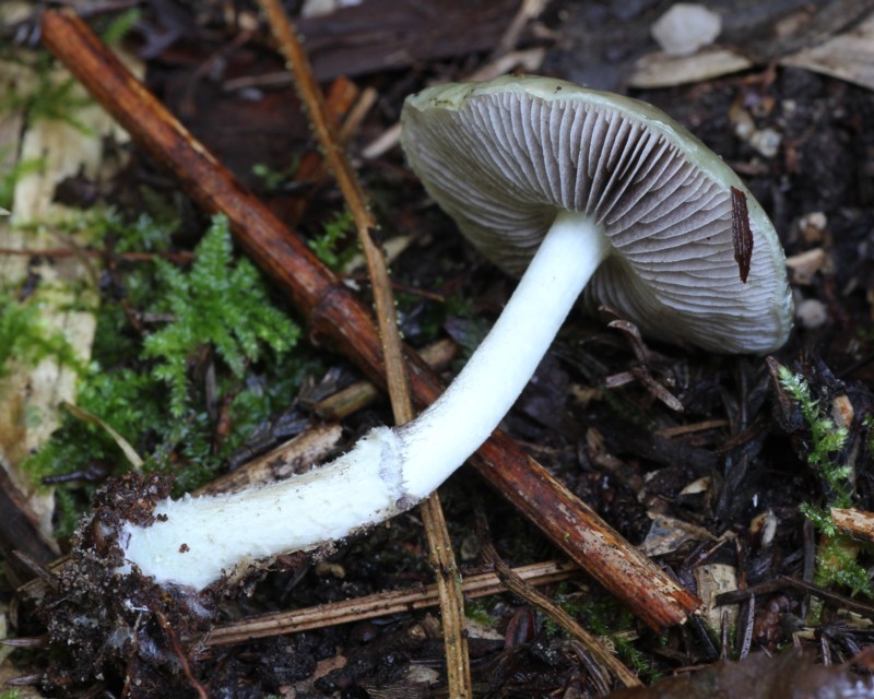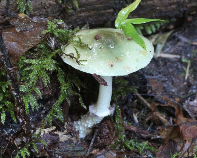 | ・柄/白色~やや帯緑色、下方やや太まり中空。基部に白い菌糸束があり、中ほどに消失しやすい膜質のつばがある。つばより下では白色綿毛状の鱗片を生じる。 |
