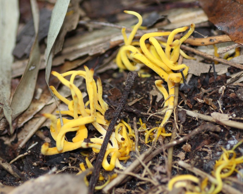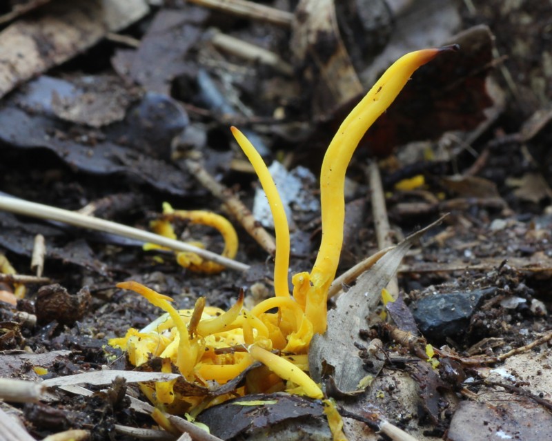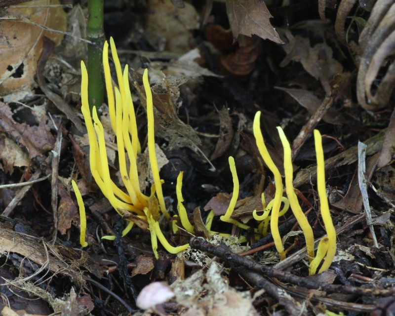 写真は落葉に埋もれたものを掻き分けて撮ったものです。かなりよじれてますが、普通はもっと直立するようです。良く似た「キソウメンタケ」は、単生し、子実体の先端は普通尖らず鈍頭をしている事で見分けられるとの事。