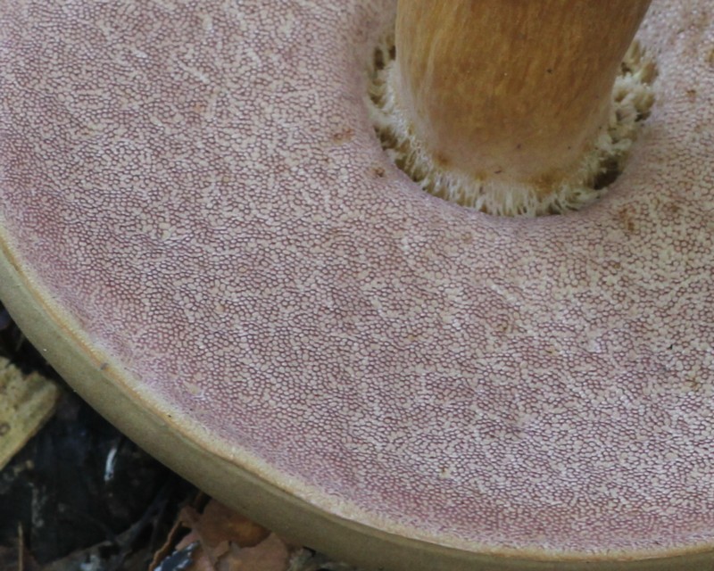 | ・管孔/上生〜ほぼ離生、白色のち淡紅色。孔口は小角、初めから淡紅〜ワイン色を帯び、傷ついても変色しない。 |