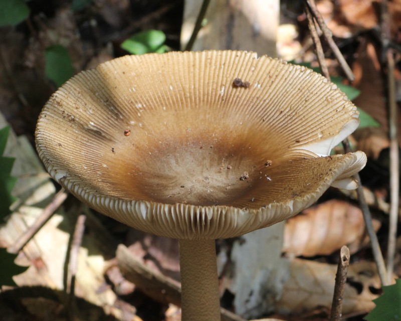 | ・傘/卵形〜円錐形〜中丘扁平。表面は粘性なく、灰褐色〜暗褐色で周辺は淡く長い溝線がある。 |
