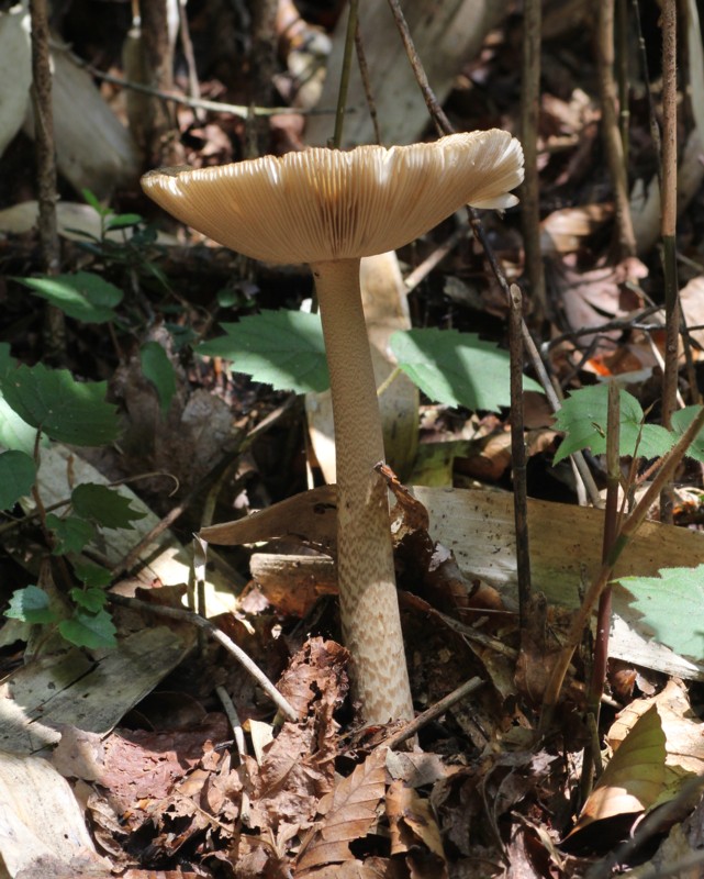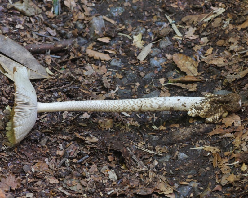 | ・柄/太さ0.8〜1.5cmの逆棍棒状で中空。表面は傘と同色の粉状鱗片が密に覆い、成熟につれて中位以下はだんだら状になる。基部は白色膜質の鞘状のつぼに包まれる。つばは無い。 |