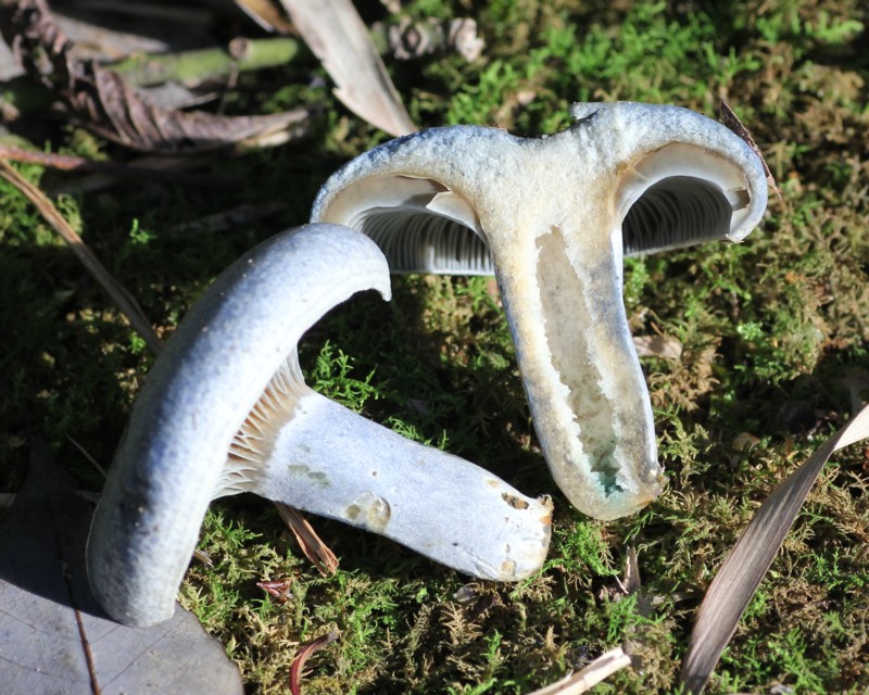 | ・肉/ほぼ白色で表皮下広く表面色を帯びる。断面は切断直後に青変、藍色の乳液を少量分泌し、のち緑色に変わる。 |