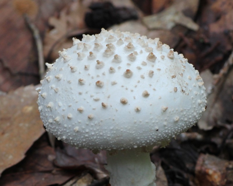 | ・傘/半球形→饅頭形→扁平。表面は白色〜乳白色で、のち部分的に淡赤褐色を帯びる。全面にやや永存性の錐形のいぼを散布する。 |