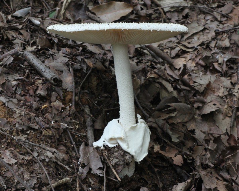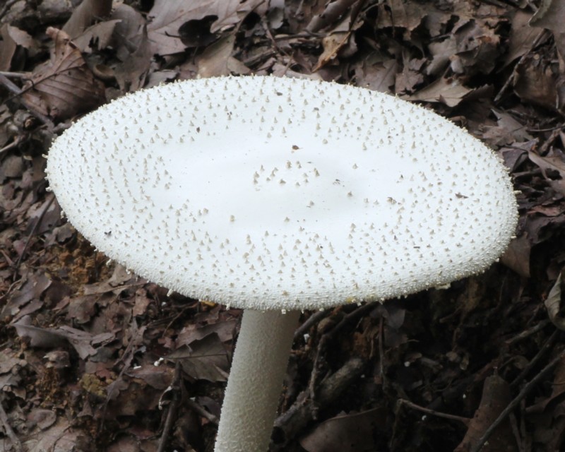 | ・傘/半球形→饅頭形→浅皿状。表面は粘性無く白色、微粉に覆われ、錐状の落ちやすいいぼを多数散布する。 |