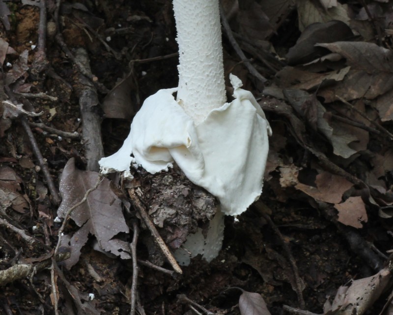 | ・柄/径1.5〜2.5cm、基部は棍棒状に膨らんで多数のいぼを輪状につける。表面は白色で綿質の細かい鱗片に覆われ、上方に落ちやすい膜質状の大形のつばがある。 |