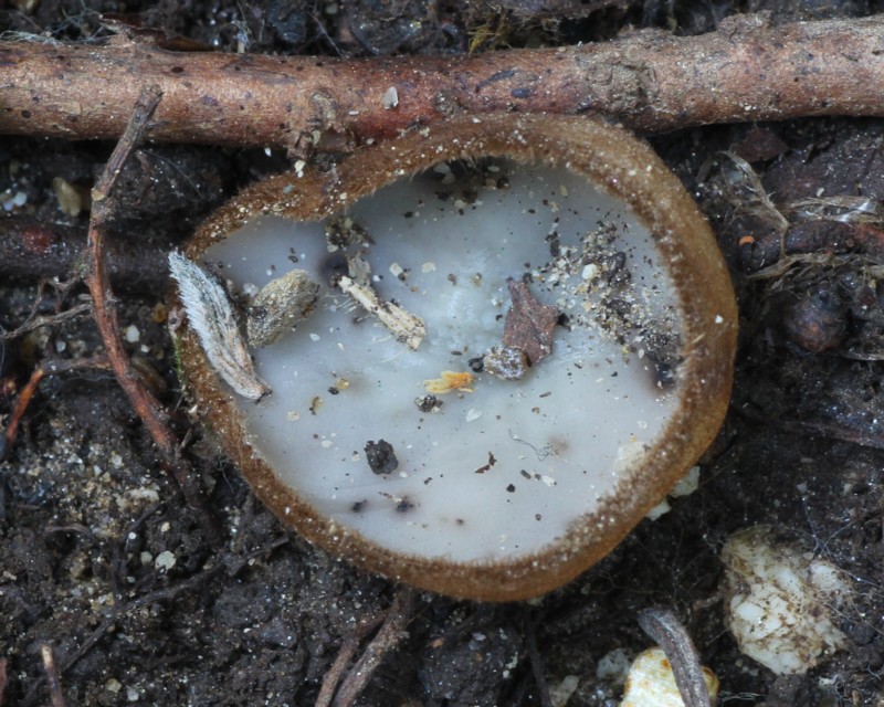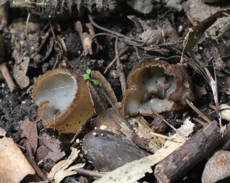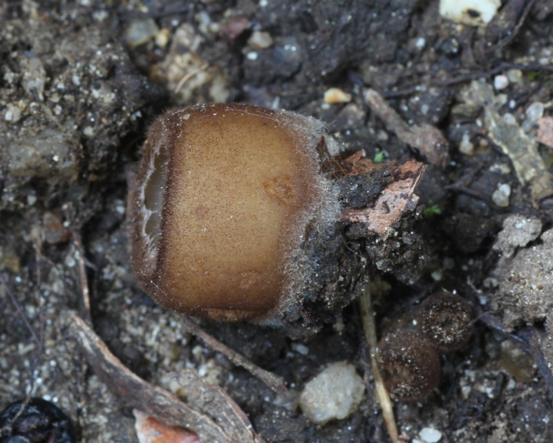 | ・子嚢盤/径1〜3cmの半球形〜椀形で無柄。幼時は球形で黒褐色の剛毛に覆われ、熟して頂部より開孔する。 |