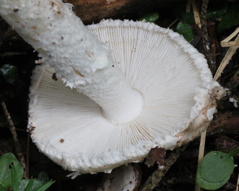 | ・柄/径5〜10mm、根もとは太まり、表面は白色で傘同様の鱗片に覆われる。基部に白色〜淡紅褐色の厚い膜質つぼがある。つばは無い。 |