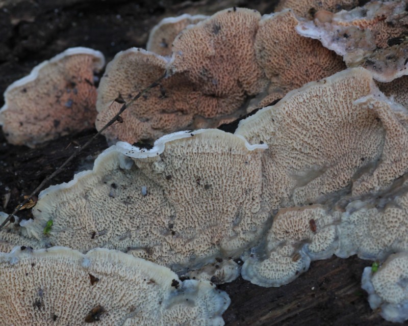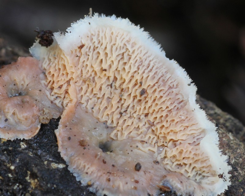 | ・子実層托/縦横の皺によって不規則で角ばった浅いシワ穴を形成する。生育中は淡黄色〜肉色。 |