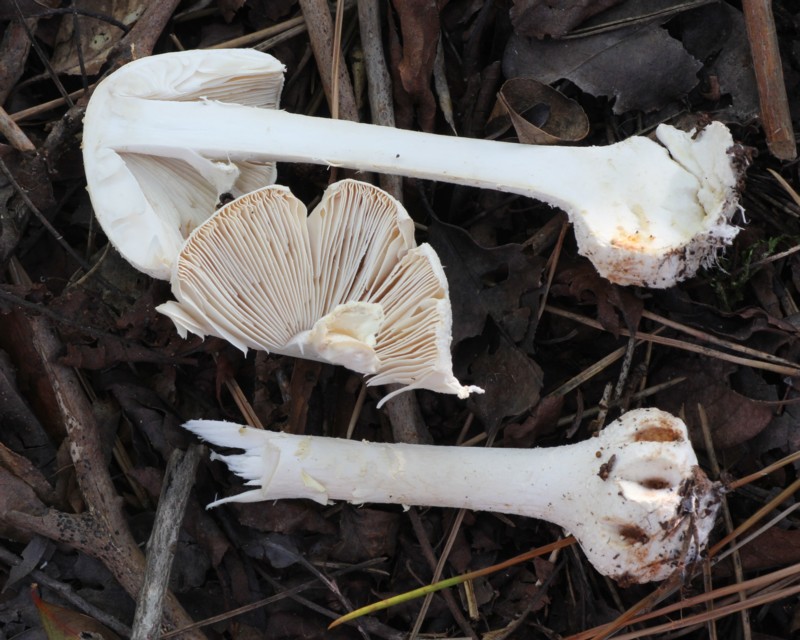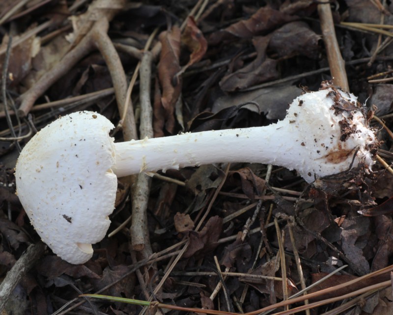 | ・柄/径6〜8mm、ほぼ円柱形で基部はカブラ状に膨大する。表面は白色、綿くず状から繊維状の小鱗片に覆われる。つばは白色膜質。 |