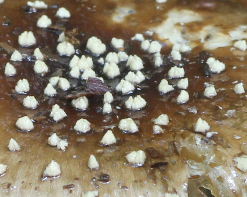 | ・傘/半球形〜扁平。表面は灰褐色〜暗褐色で周辺には溝線がある。全面に白から淡褐色の小さい角錐形のいぼを散布する。 |