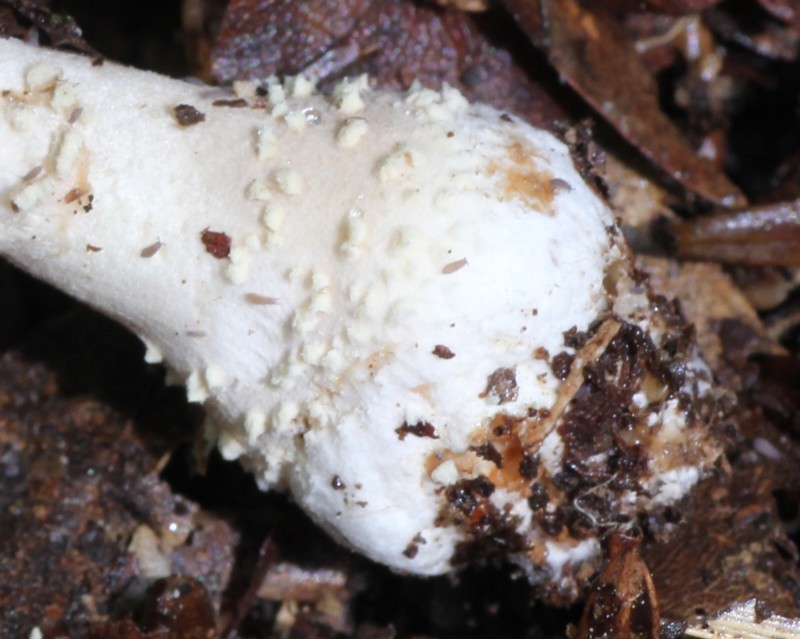 | ・柄/径4〜12mm、上下同径で基部は肥大し球根状になる。表面は白色、つばは灰白色の膜質で極めて薄く消え去りやすい。基部表面には小形のつぼの破片が環状に付着する。 |