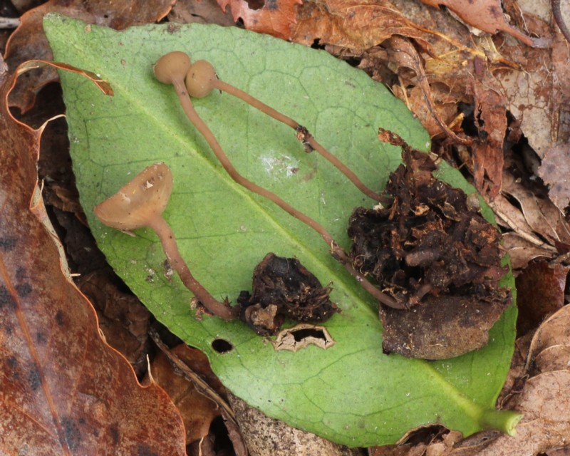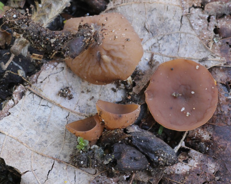 | ・子嚢盤は椀形、のち皿形で暗褐色。1個の菌核から1〜数個生じ、通常長い柄がある。 |