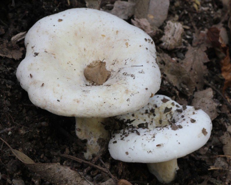 | ・傘/中央窪む饅頭形→漏斗形。表面は粘性なく、白色のち淡帯黄色。多少しわがあり、しばしば汚黄褐色のシミができる。 |