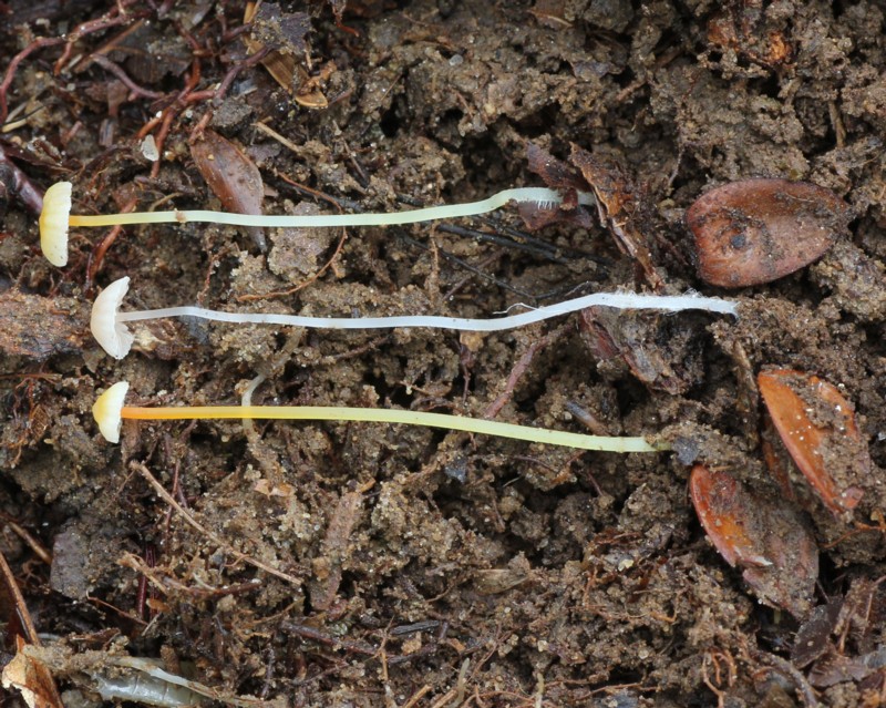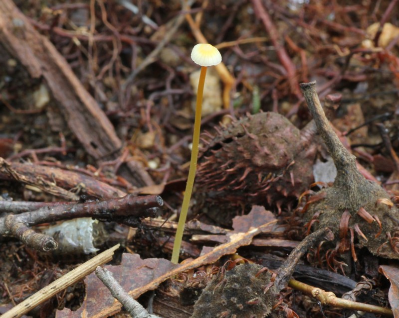 | ・柄/直径1mm、黄色~淡黄色。頂部は帯橙色、基部は黄白色で根状に伸び、長軟毛をつける。 |