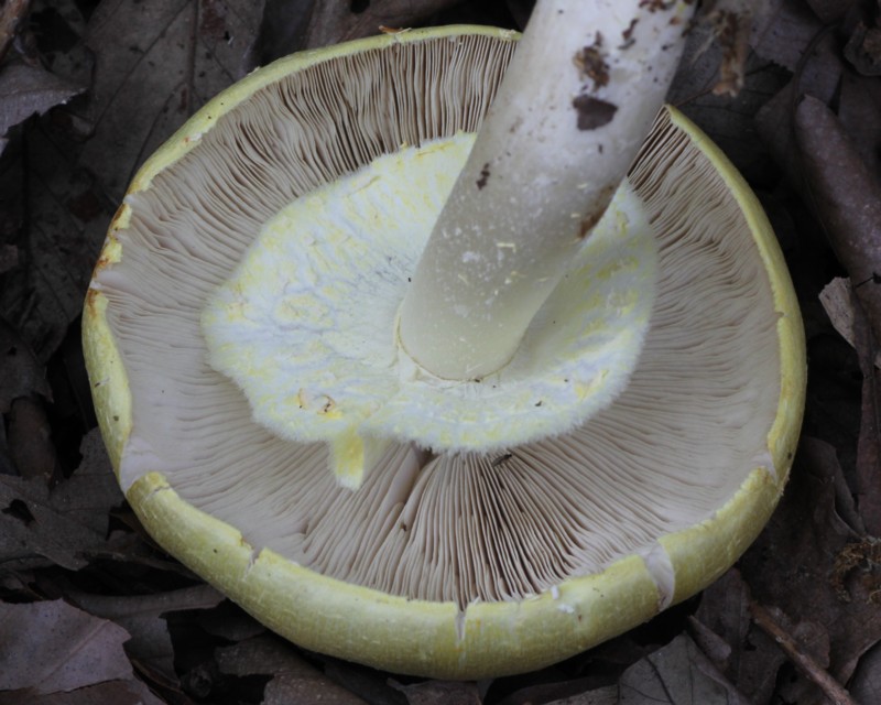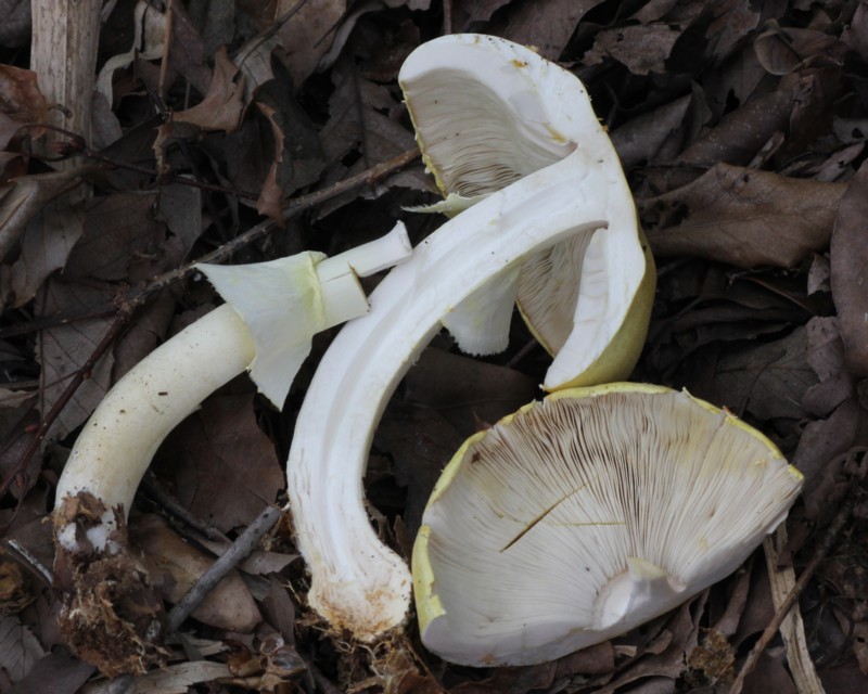 | ・柄/径1〜1.5cm、下方はやや太く、基部は急に塊茎状に膨らむ。表面は白色、触れると淡黄色に変わる。つばは柄の上部につけ白色膜質、下面は綿くず状。 |