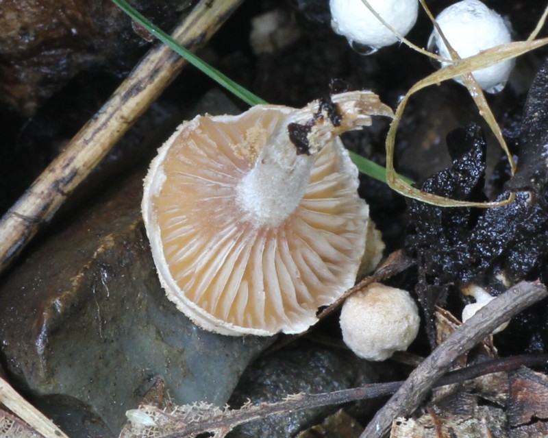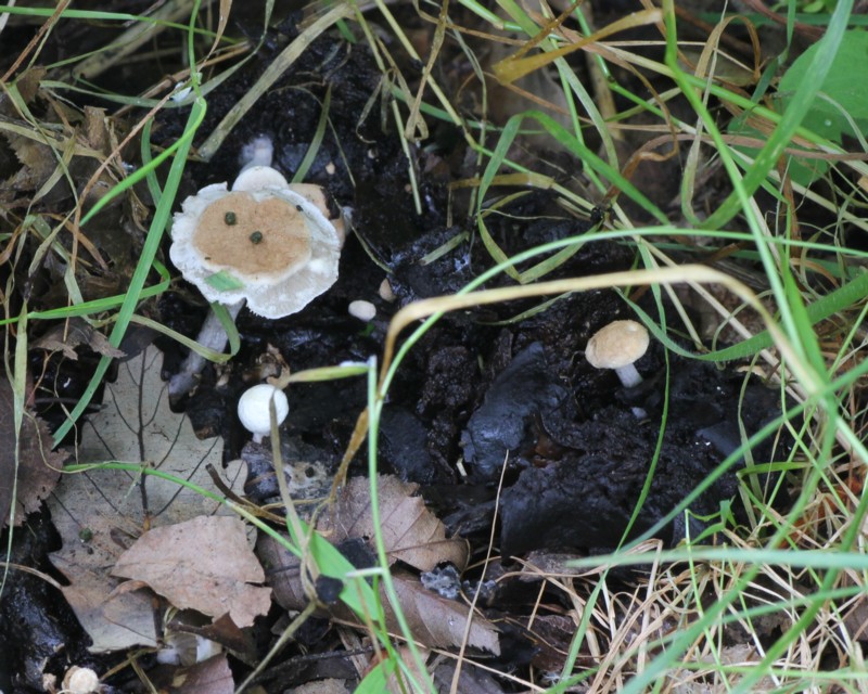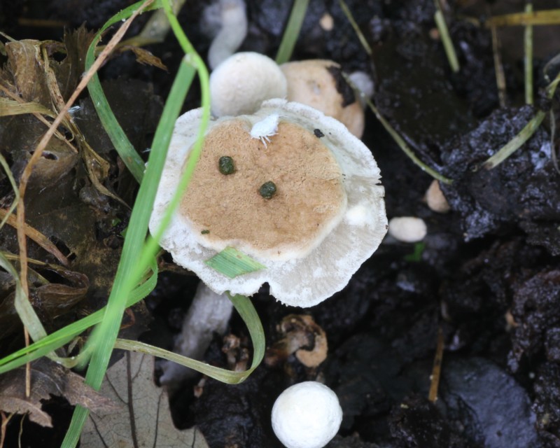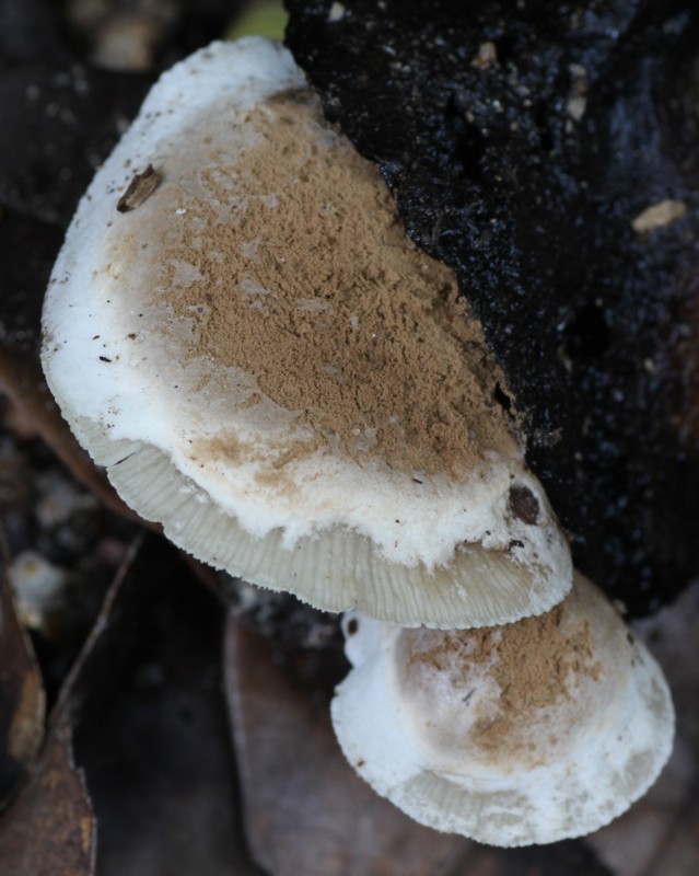 | ・傘/半球形→饅頭形→ほぼ扁平。表面は粘性なく、初め白色平滑でのち粘土褐色の粉塊(厚膜胞子)になる。 |