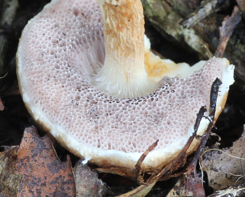 | ・管孔/ほとんど離生。初め多少ピンク色をおびた白色、のち灰紅〜紅紫褐色。孔口は多角形、管孔と同色。 |