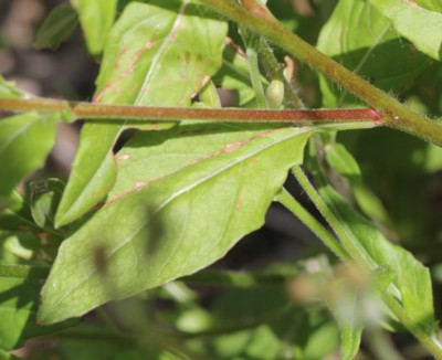 ・葉は互生、長さ3〜5cm、幅1〜2cmの披針形〜卵状披針形で波状の浅い鋸歯がある。
