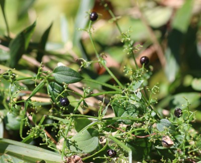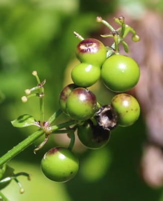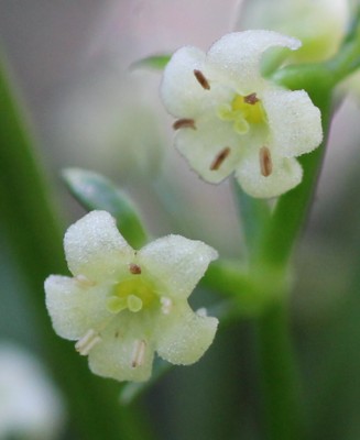 ・茎先や葉腋に花序を出し、直径3〜4mmで黄緑色の花をつける。果実は直径5〜7mmの球形で黒く熟す。