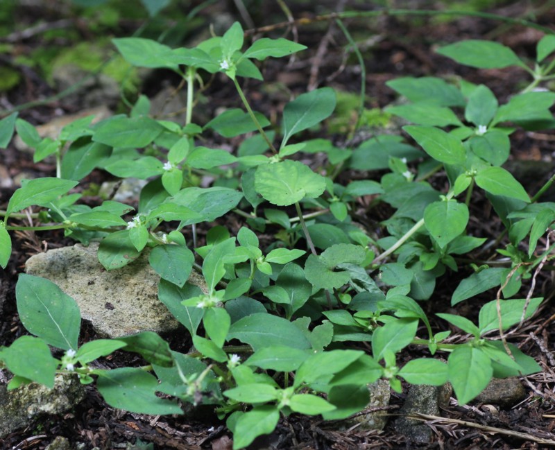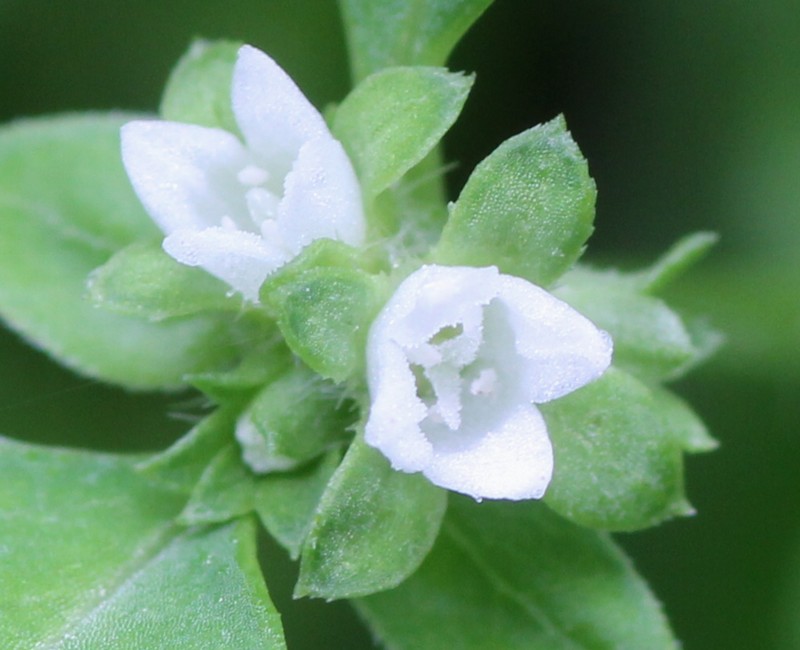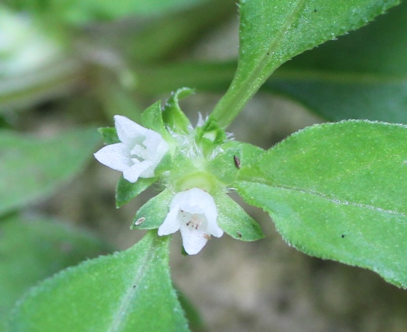 ・茎の先端や葉腋に白色で直径2mmの花を数個つける。花冠は、筒状で4裂する。