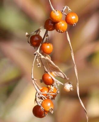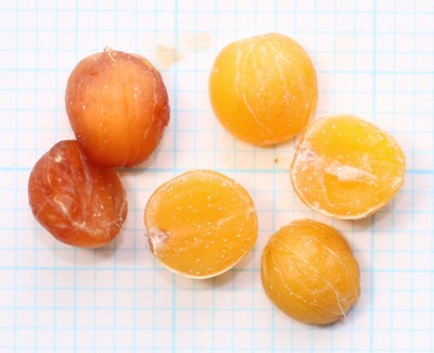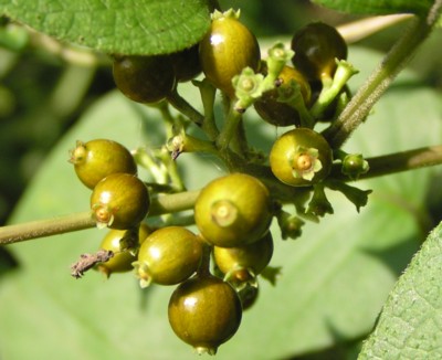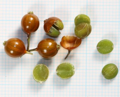 | ・果実は核果。直径約5mmの球形で熟すと黄褐色になる。中に2個の核がある。 |