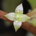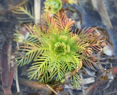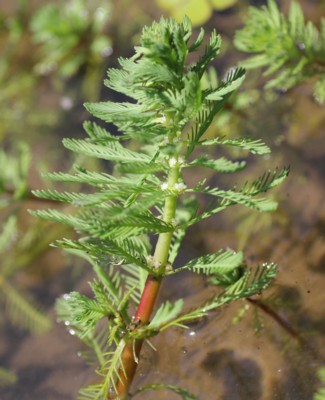 ・茎は約5mmの円柱形。葉は緑白色で羽状に裂け、3〜7個を輪生する。