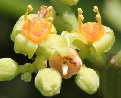 | ・花弁は緑色で4個あり、朱色の花盤がよく目立つ。 |
