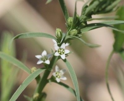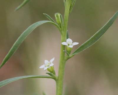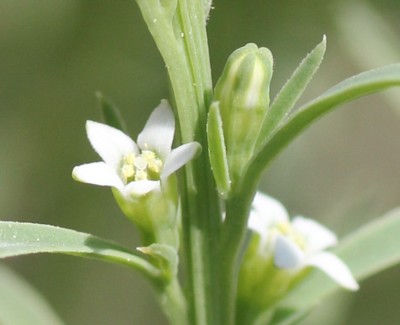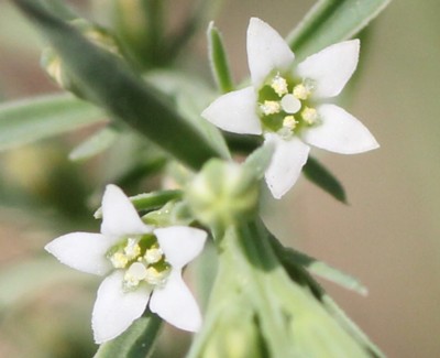 ・花は直径4〜5mmで内側は白色、外側が淡緑色、葉腋に1個ずつつける。花被は筒状で先は4〜5裂する。