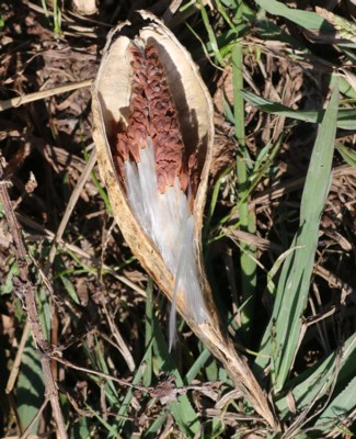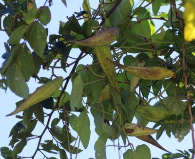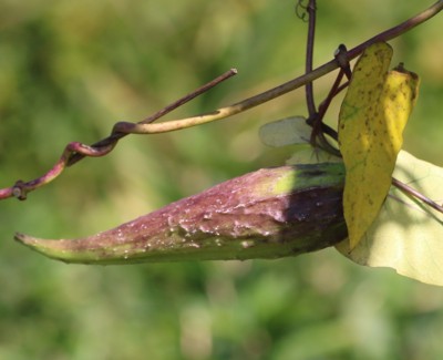 | ・果実は袋果で、長さ約10cm、幅約2cmの広披針形、表面にはイボ状突起がある。 |
