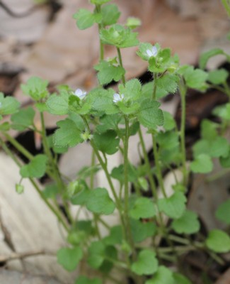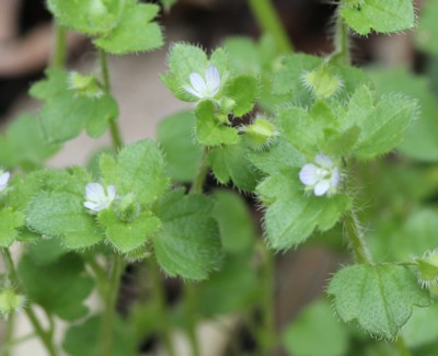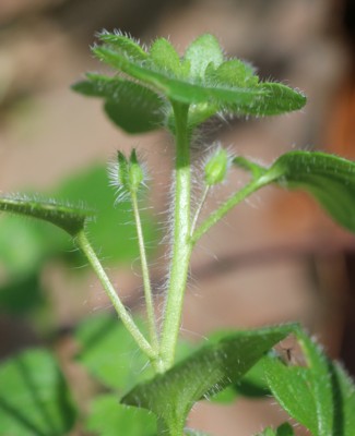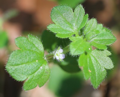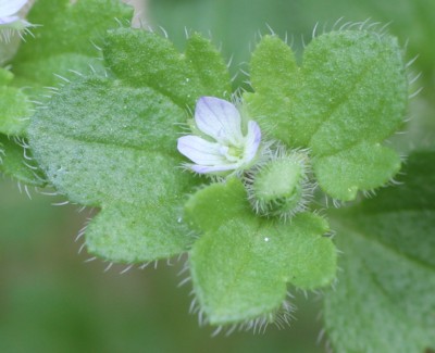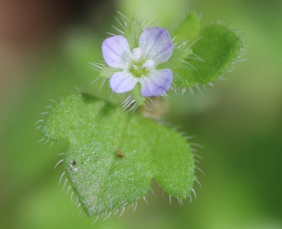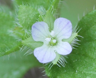 ・上部の葉腋に、3〜4mmの淡青紫色の花を一個つける。萼のふちには長い毛がある。