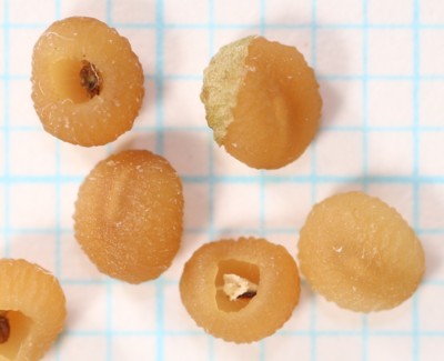 | ・種子は長さ約2.5mm。背面は丸みがあり、腹面はくぼむ。 |