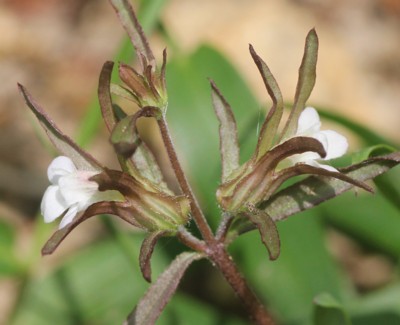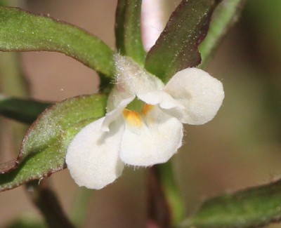 | ・花は葉腋につけ、淡紅色で長さ約1cmの唇形。上唇は2裂、下唇は3裂し中央裂片には黄色の隆起した斑紋がある。 |